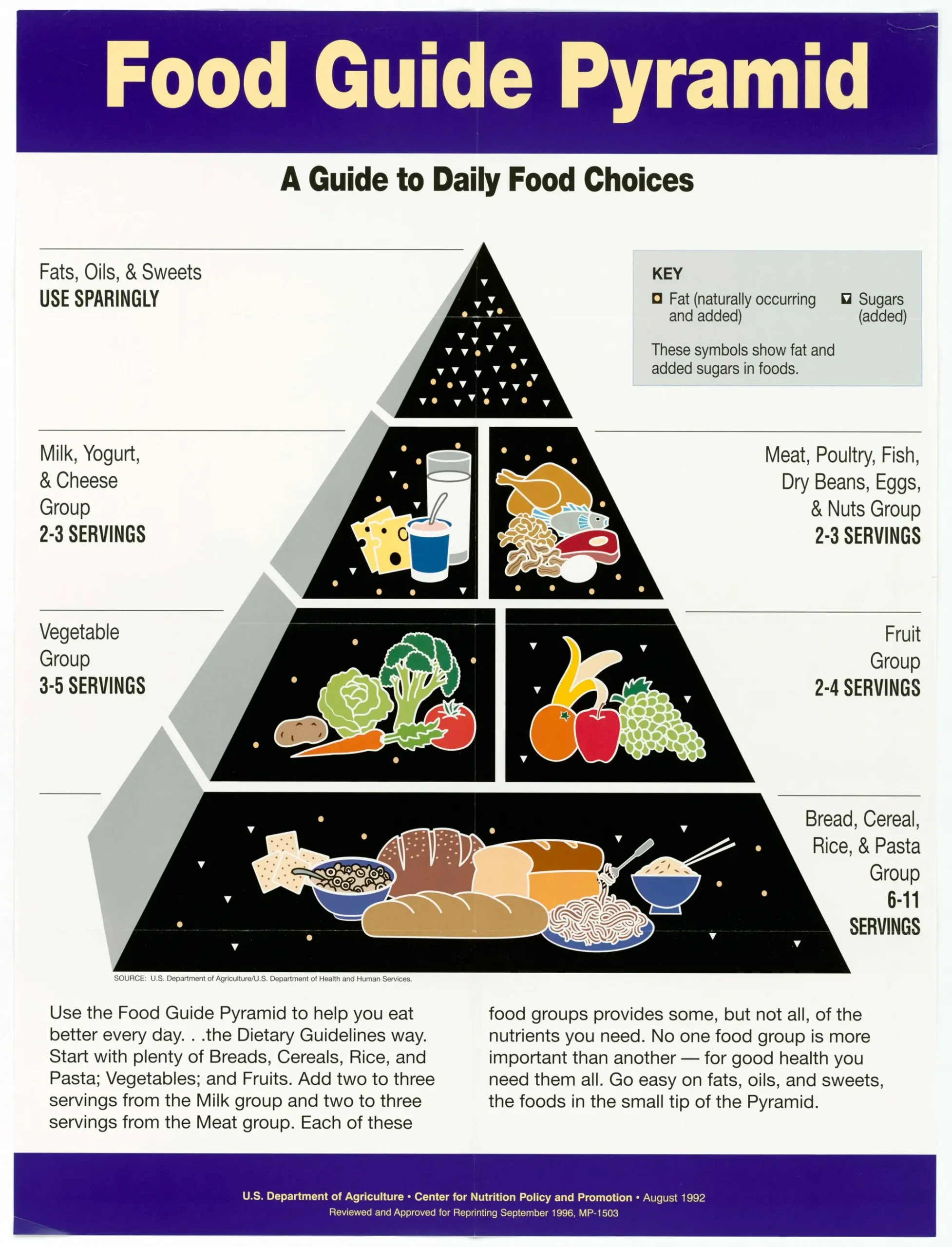 I grew up during the 5 food groups era, illustrated as the first food pyramid. This consisted of 2-3 servings of dairy, 2-3 servings of meat, 3-5 servings of vegetables, 2-4 servings of fruit, and a whopping 6-11 servings of bread, rice, cereal and pasta. That’s a lot of food to stuff into one day.